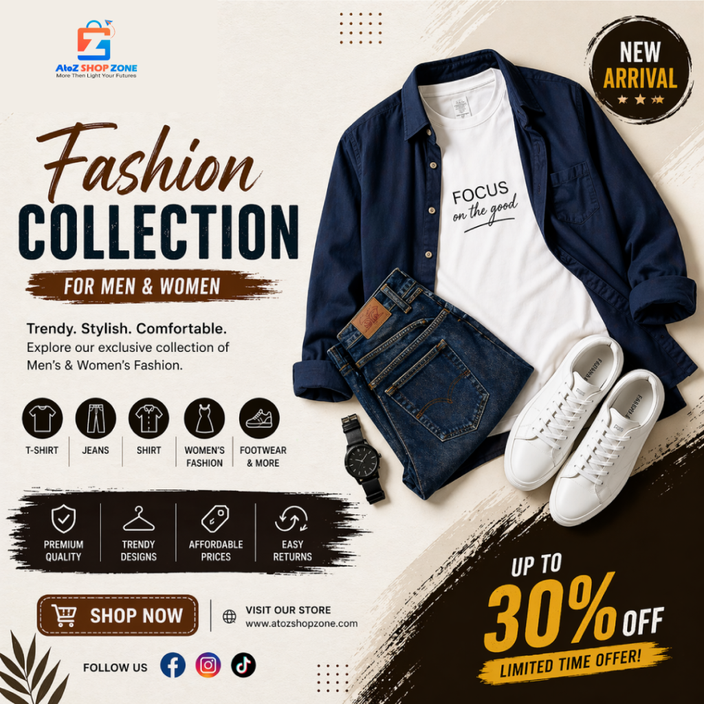 AtoZ Shop Zone এ আমরা নিয়ে এসেছি latest Men’s & Women’s Fashion Collection – যেখানে style, comfort আর quality একসাথে পাবেন।