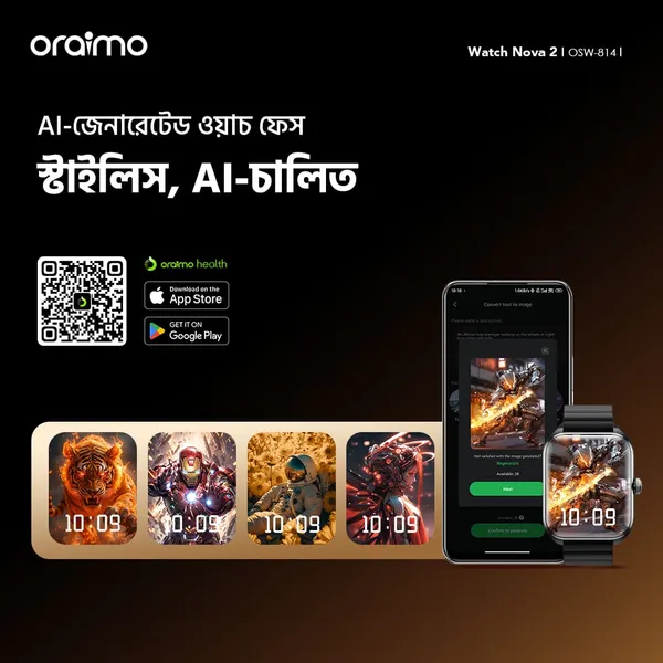 oraimo health অ্যাপে ১২০+ ডিজাইনসহ AI-ক্রাফটেড Watch Nova 2 এর ফেসগুলো আবিষ্কার করুন।